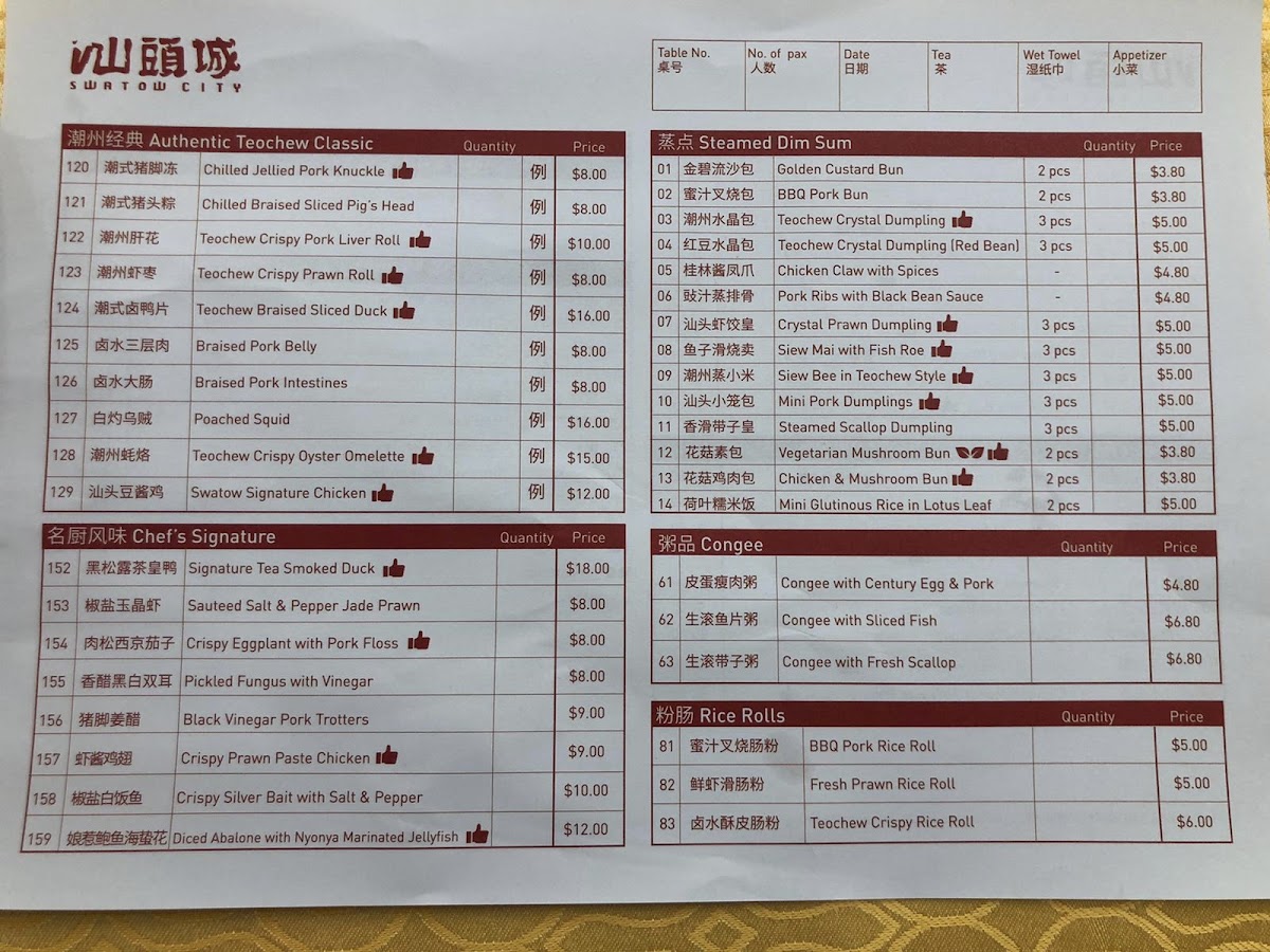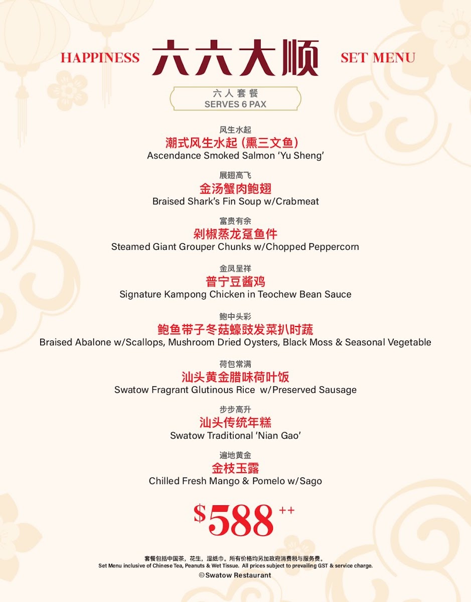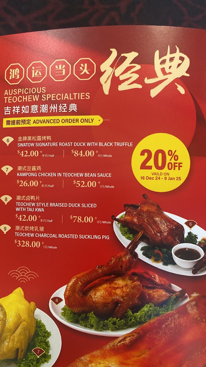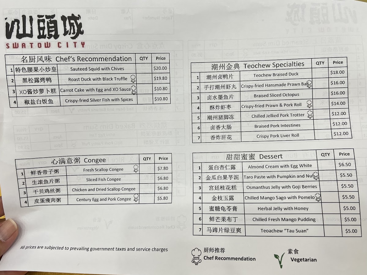 From a reviewer’s perspective, the menu at Swatow City offers a well-rounded showcase of Teochew cuisine, highlighted by thoughtfully curated set options like the Happiness Set Menu For 2 Pax, Joyful Set Menu For 2 Pax, and larger group selections such as the Happiness Set Menu For 4 Pax and Joyful Set Menu For 4 Pax, which provide convenient and value-driven dining experiences. The à la carte offerings are equally impressive, with signature dishes such as Roasted Duck With Black Truffle (Half) and Swatow Fried Cray Fish With Omelet And Leeks standing out among the Teochew specialties, alongside classics like Teochew Prawn Roll and Teochew Chilled Jellied Pork Knuckle. The soup selection, including Teochew Style Braised Shark’s Fin Soup With Crab Meat and Double Boiled Chicken Soup And Dried Scallop With Matsutake Mushroom, reflects a strong emphasis on traditional flavors and premium ingredients. Seafood lovers will appreciate dishes like Fried Deshelled Prawn With Wasabi Mayonnaise And Fruits and Sautéed Scallop And Fresh Lily Bulbs With Macadamia Nuts, while hearty meat options such as Pan Fried Pork Chop With Home Made Sesame Sauce and Sweet And Sour Pork With Pineapple add balance to the menu. Complementing these are comforting staples like Braised Ee Fu Noodle With Mushrooms and Fried Pearl Rice With Scallop And Prawn, as well as classic desserts including Teochew Taro Paste With Pumpkin And Gingko Nuts and Chilled Fresh Mango Sago With Pomelo. Overall, the menu feels extensive yet cohesive, catering to both traditional tastes and modern palates, making it a satisfying culinary destination.